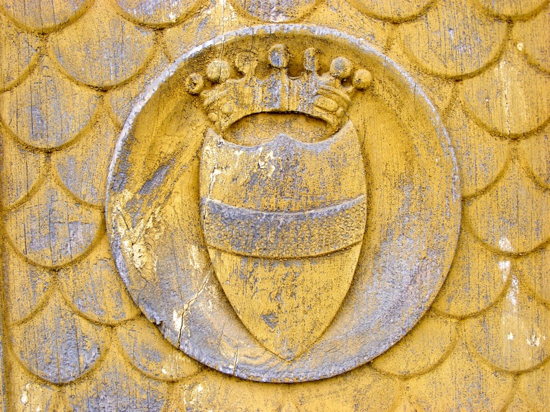 Qui sotto due particolari della facciata, lo stemma in pietra e quello inciso sul portone di ingresso.